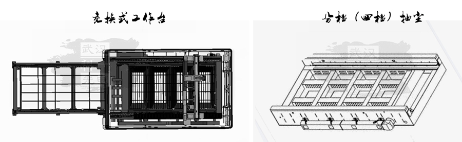 交换式工作台,缩短了上料和落料的流转时间,使得单位时间内的切割工件数量增加。