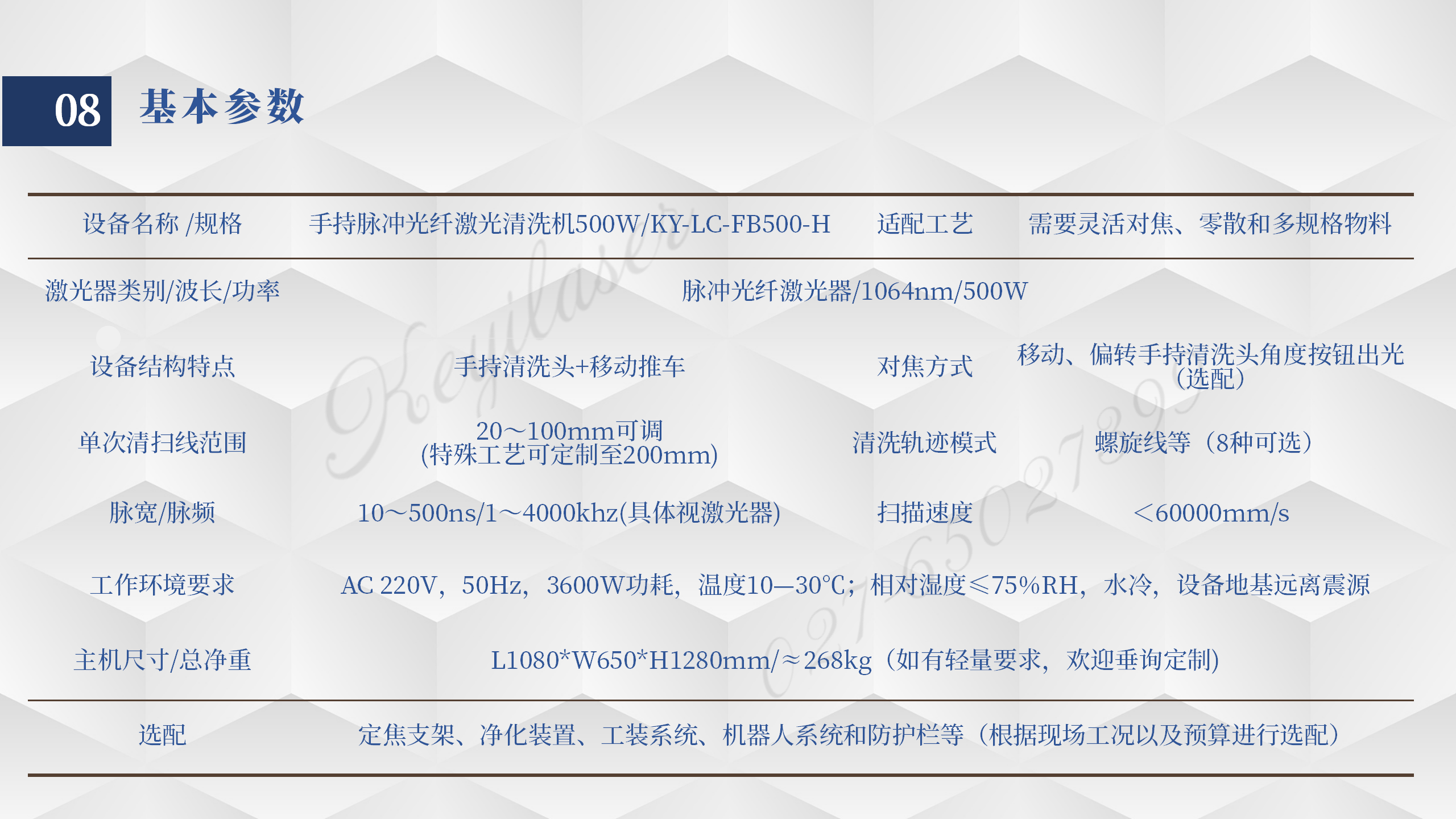 名称:激光清洗机、激光除锈机、激光去漆机 规格:KY-CL-FB300/350/500-H 用途:高效清洗锈蚀层、油漆层和氧化层等,对基材损伤程度可提要求