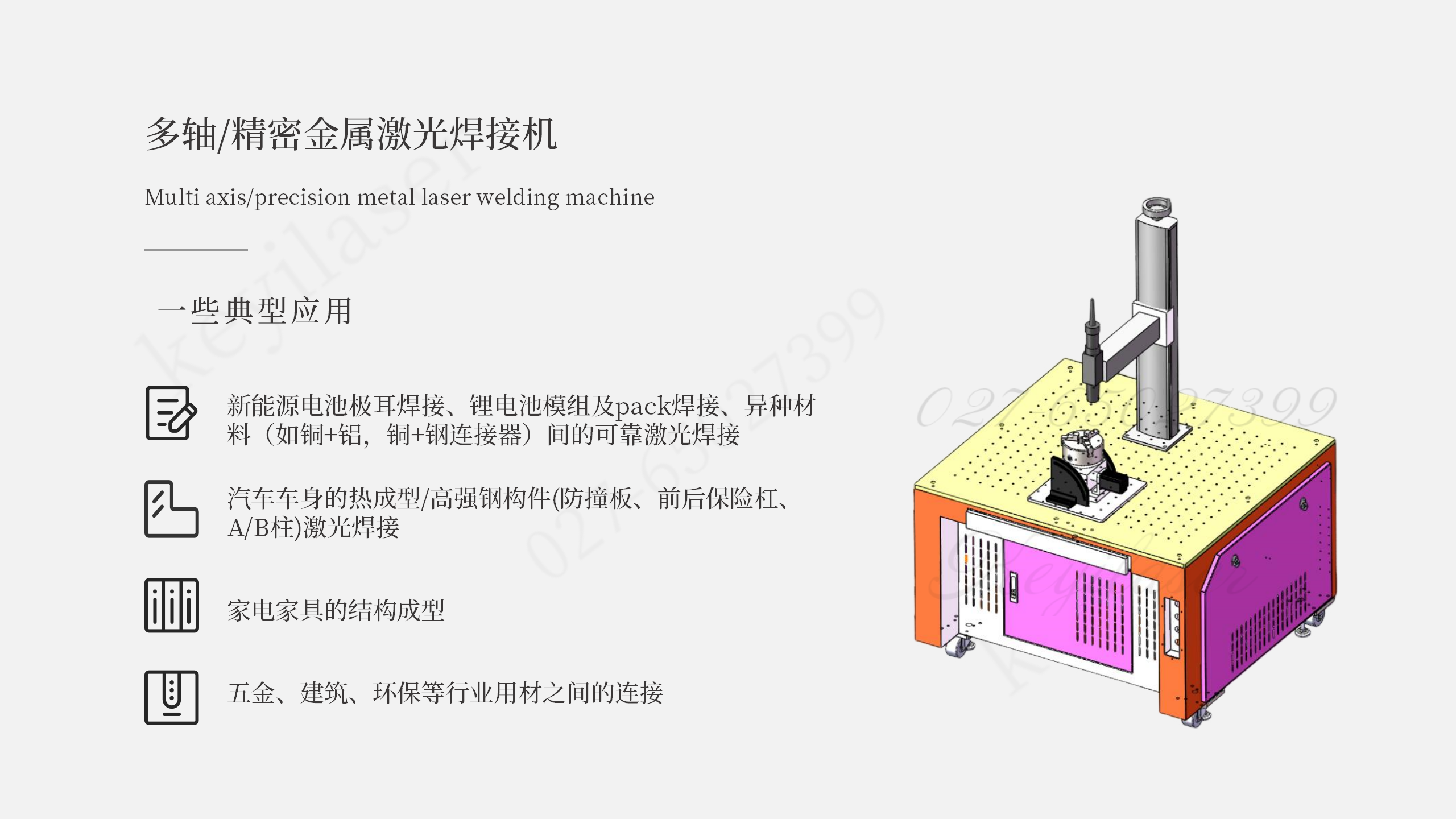 名称:精密激光焊接机、多轴激光平台焊机 规格:KY-W-FW150/300/450/600-X04/05 用途:适配金属薄材的精密焊接工艺中