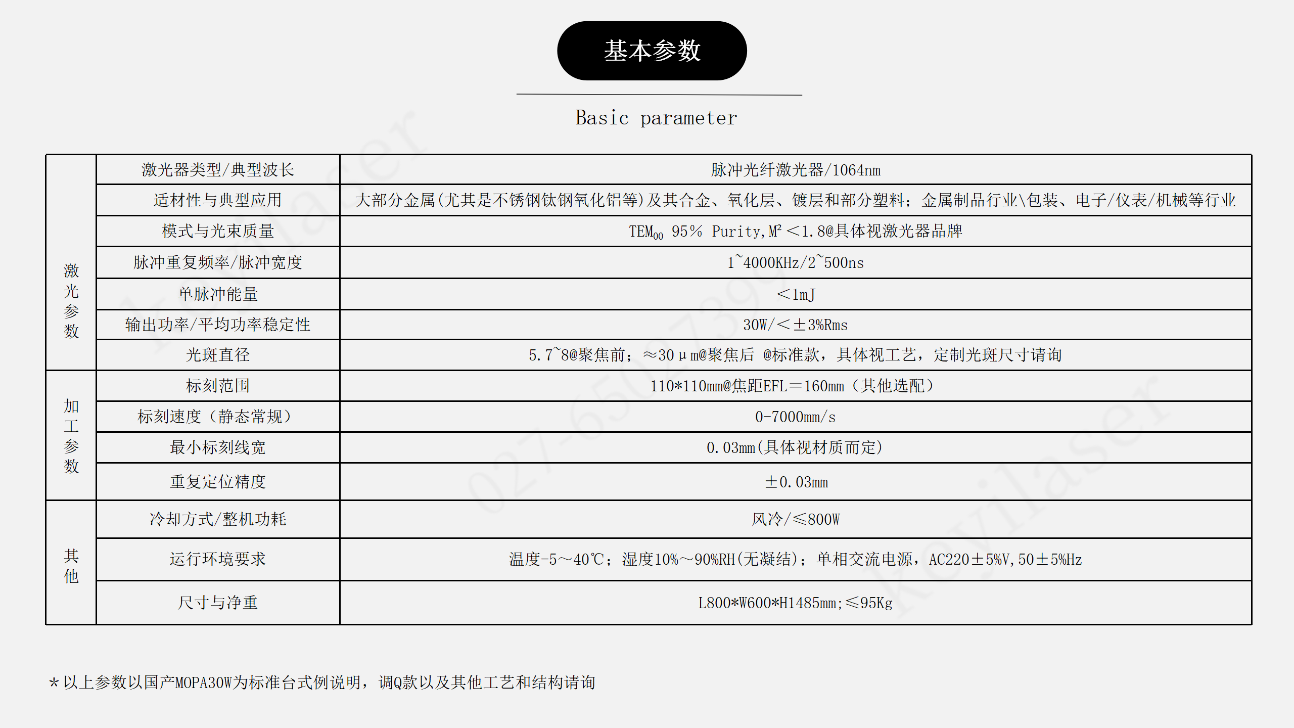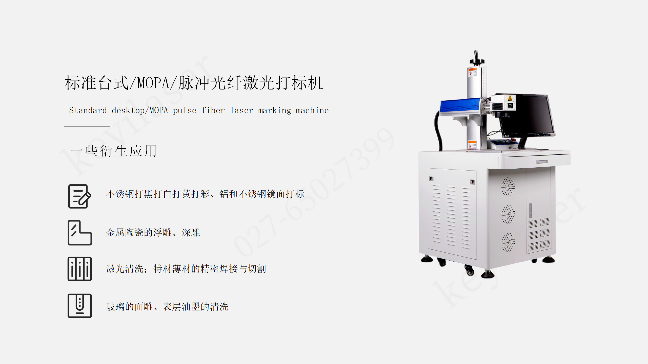 本设备为一款以新型光纤激光器---MOPAj激光器为光源具有较大脉冲宽度调整范围的光纤激光标记设备,主要用其可调脉宽来进行一些需要特定激光束(可调的脉宽和脉频)的工艺场合,比如不锈钢打彩、氧化铝打黑、金属深雕等。