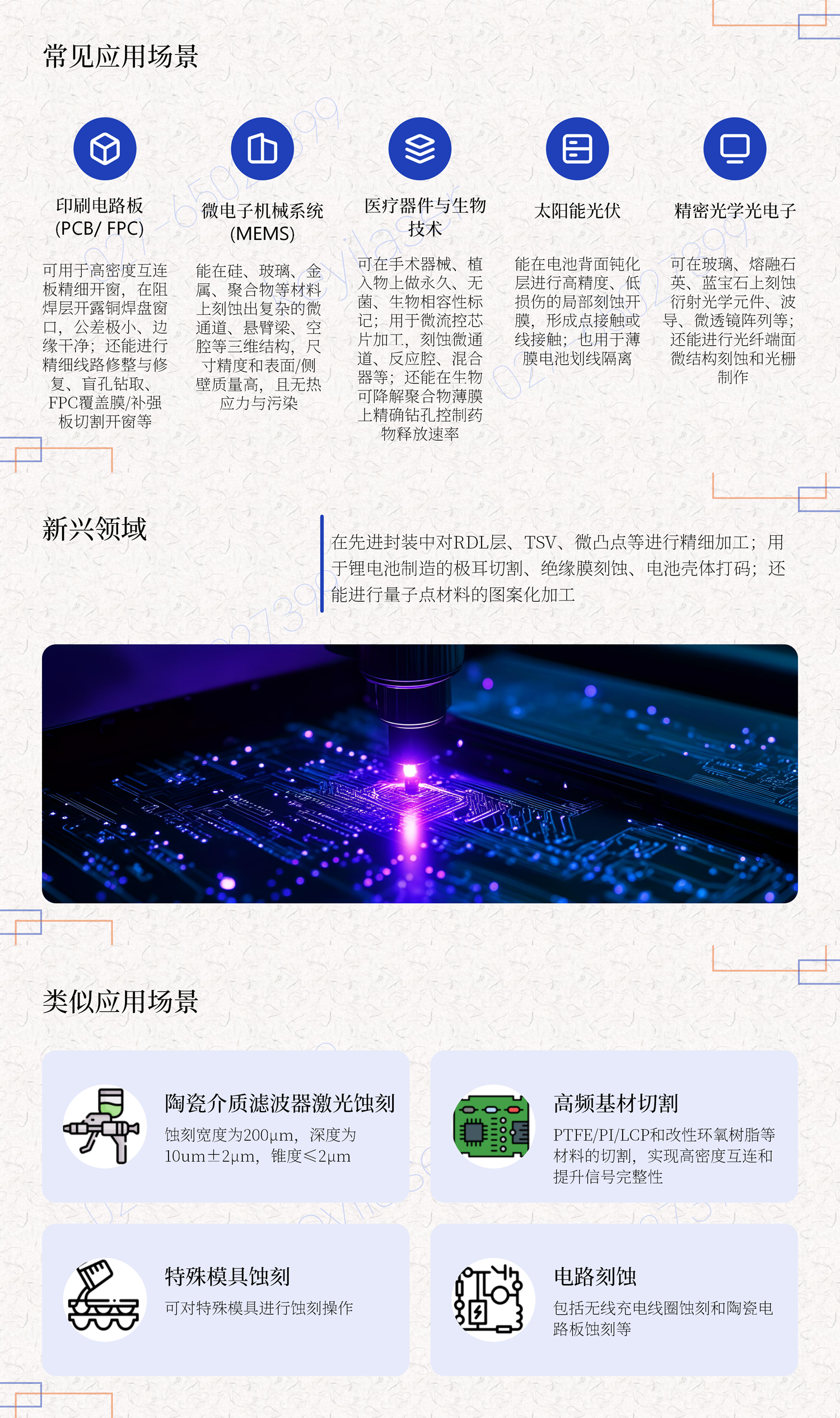 工艺:精密激光加工(刻蚀/划线/表面织构等表面微纳加工+薄材的微孔/挖槽/切割)